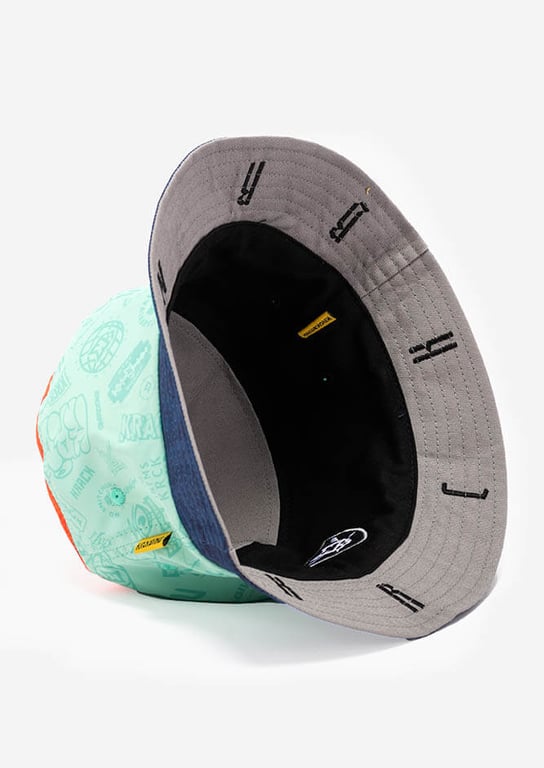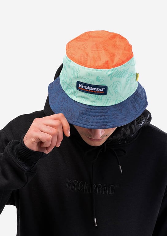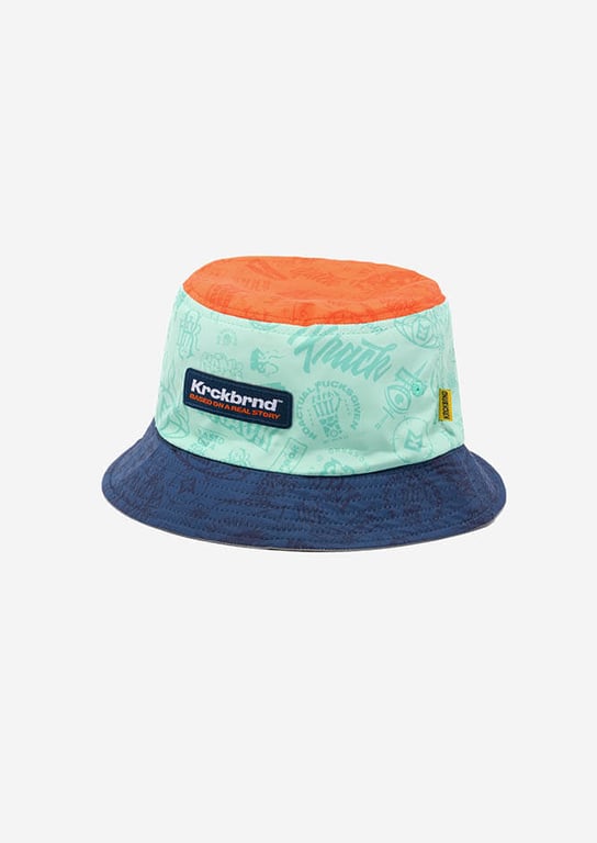Have a go at our latest bucket hat that comes with two bold and neat designs. The first face is inspired by the Raiders logo and features a black and grey color scheme, with KRCKBRND skull on the front and KRCKBRND lettering on the cap. The second face is a pastel dream, featuring light and airy color