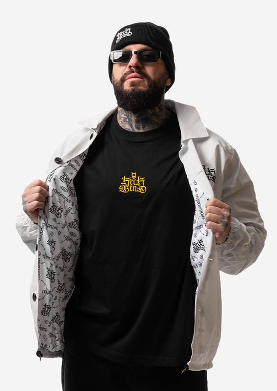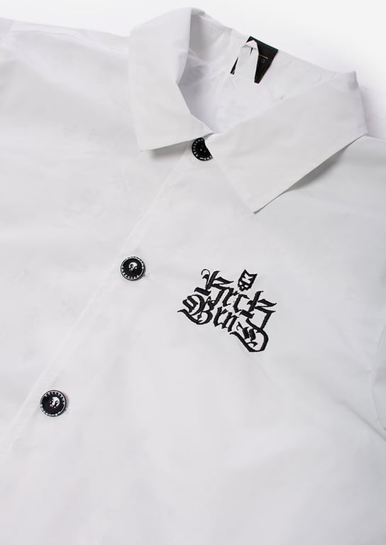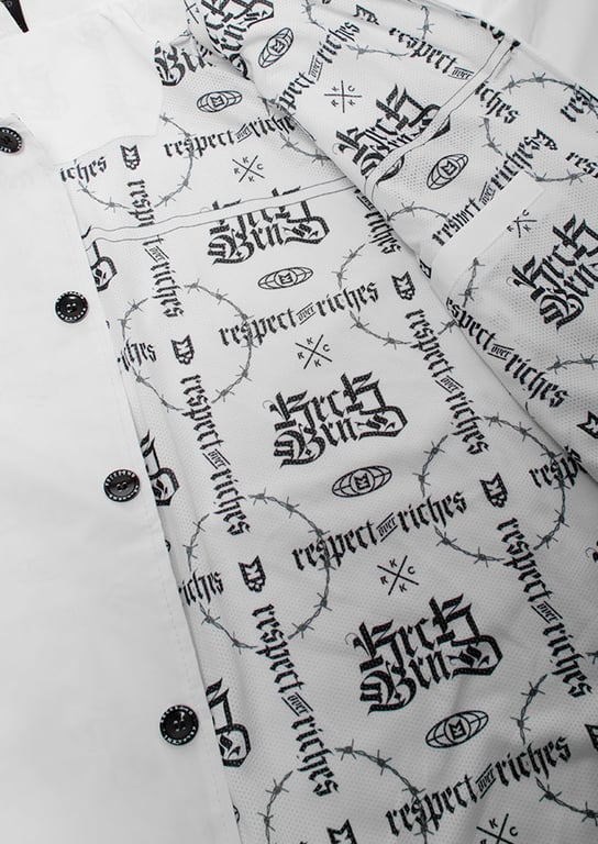 \nConfecționata dintr-un material de tip Fâș alb cu membrana impermeabila, produsul a fost personalizat prin aplicarea de broderii in partea stânga superioara si pe guler, cele 2 buzunare laterale iar interiorul a fost sublimat cu un pattern stil graffiti a denumirii brandului + logo-ul skull Krck Brnd, de culoarea neagra.